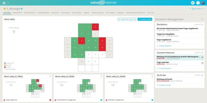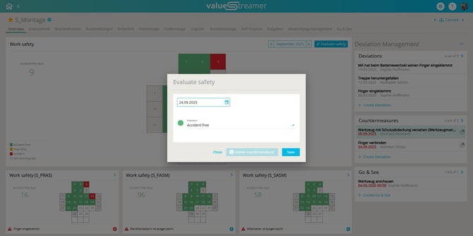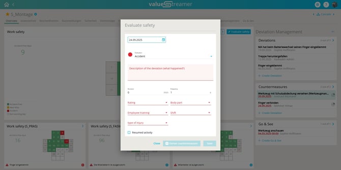 The core KPI “Work Safety” enables systematic recording of accidents, near misses, and accident-free days. The safety cross visualizes the daily safety status and supports teams in analyzing and deriving measures. Through system administration, input fields, mandatory information, and additional details can be flexibly configured.