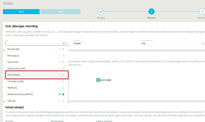 Im KPI-Editor (Schritt 2) steht mit „Zeit“ eine neue Standard-Einheit zur Verfügung. Werte können dabei bequem über einen Time Picker im Format hh:mm eingegeben werden.