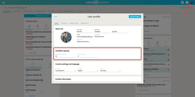 📸 Screenshot: Benutzerprofil mit SOLL-Kapazität und Reserve-Eingabe