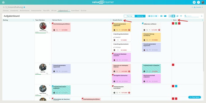Zeiträume sind in Swimlanes gegliedert (z. B. „Aktuelle Woche“, „Nächste Woche“). Diese Bezeichnungen sind individuell anpassbar.