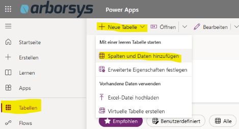 Falls keine passende Tabelle existiert, muss eine neue erstellt werden. Über „+ Neue Tabelle“ → „Spalten und Daten hinzufügen“ kann eine leere Tabelle mit individuellen Spalten angelegt werden.
