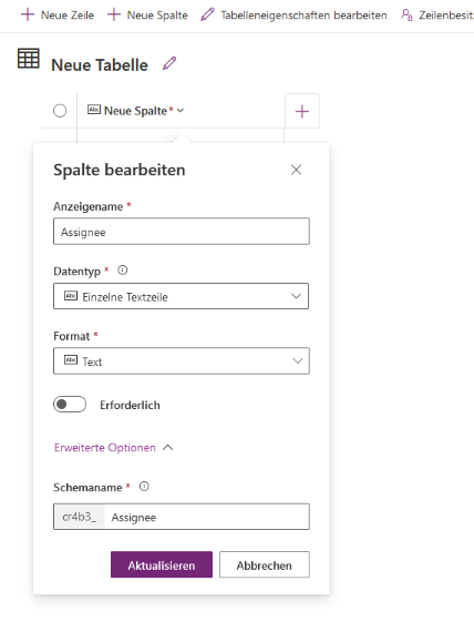 💡 Manuell hinzugefügte Spalten erhalten automatisch den internen Prefix cr4b3_, z. B. cr4b3_Assignee.