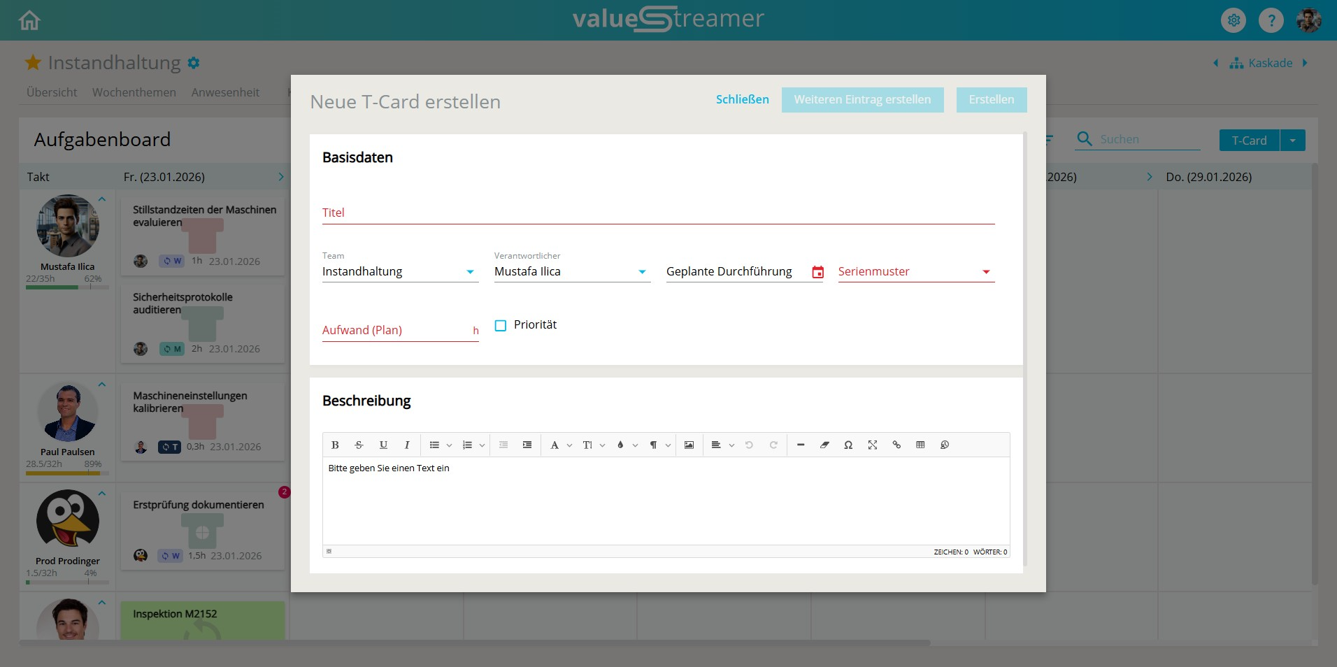 Definieren Sie TâCards fĂźr alle regelmäĂigen FĂźhrungsroutinen (z.âŻB. Sicherheitsrundgänge, Schichtabnahmen).