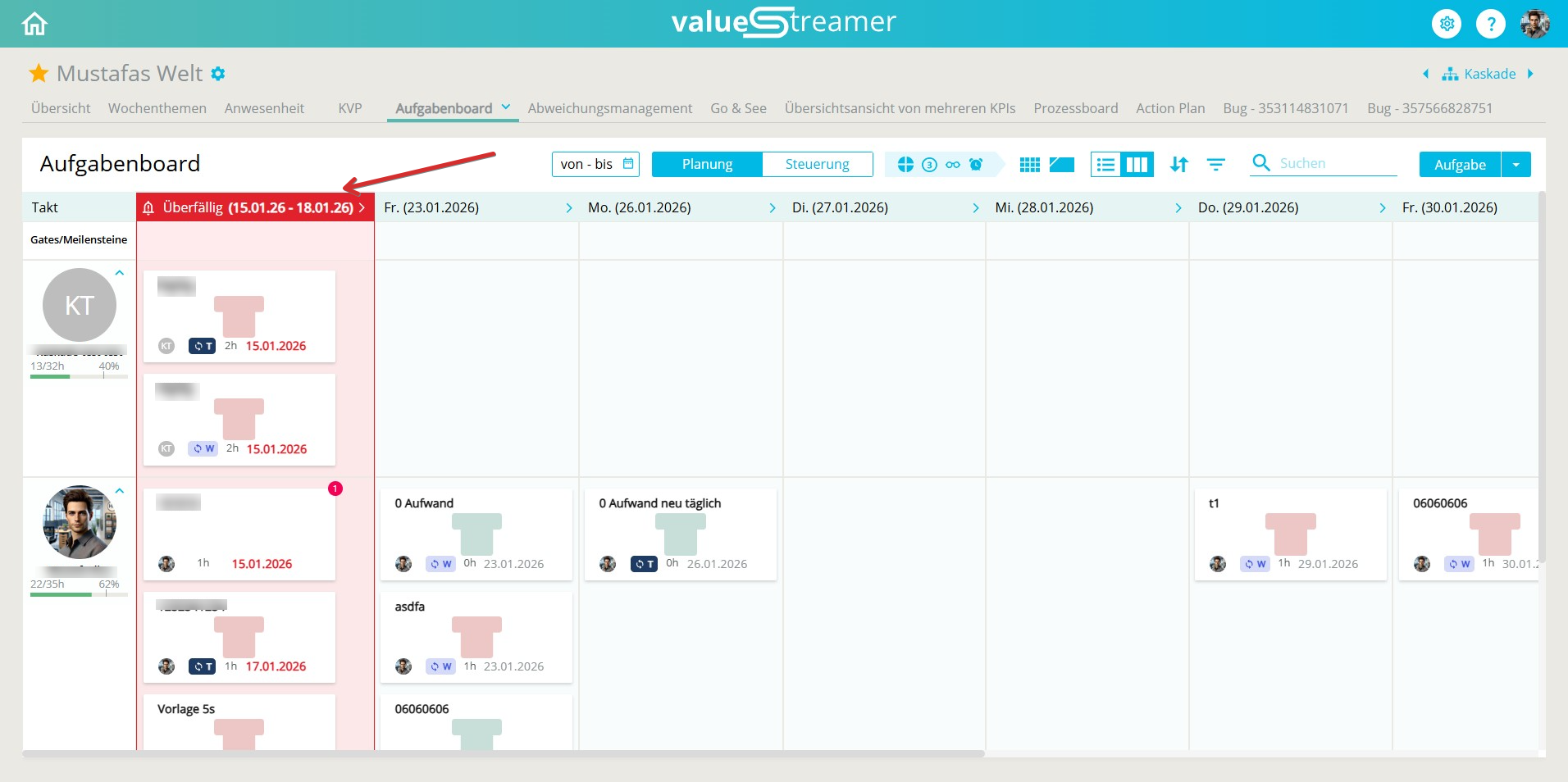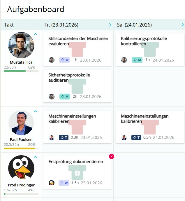 TâCardâAufgaben werden im Aufgabenboard direkt in der Spalte ihres geplanten Datums (Ende Plan) angezeigt. Sie sind anhand ihrer Form und Farbe leicht von normalen Aufgaben zu unterscheiden.