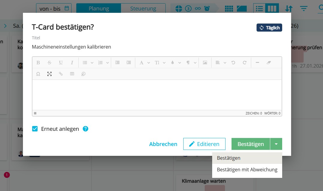 Beim Klick auf eine TâCard in der Planungsansicht Ăśffnet sich der Bestätigungsdialog.